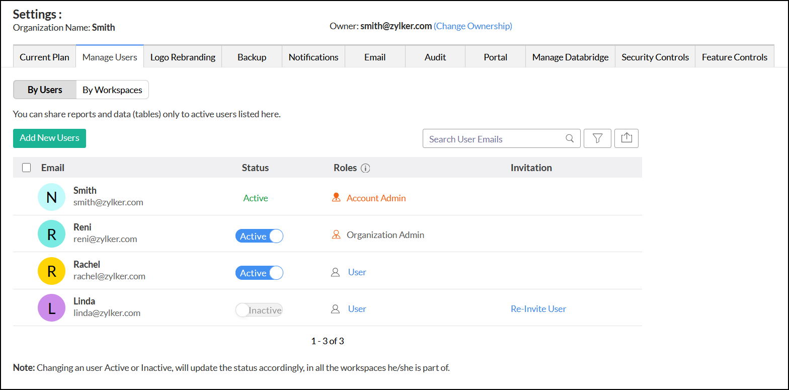 Analytics Plus allows you to manage all the users in your Organization using the Manage Users tab in the Settings page. All users added to your Organization will be listed here. You can add, remove, change role, activate, and deactivate users from here.