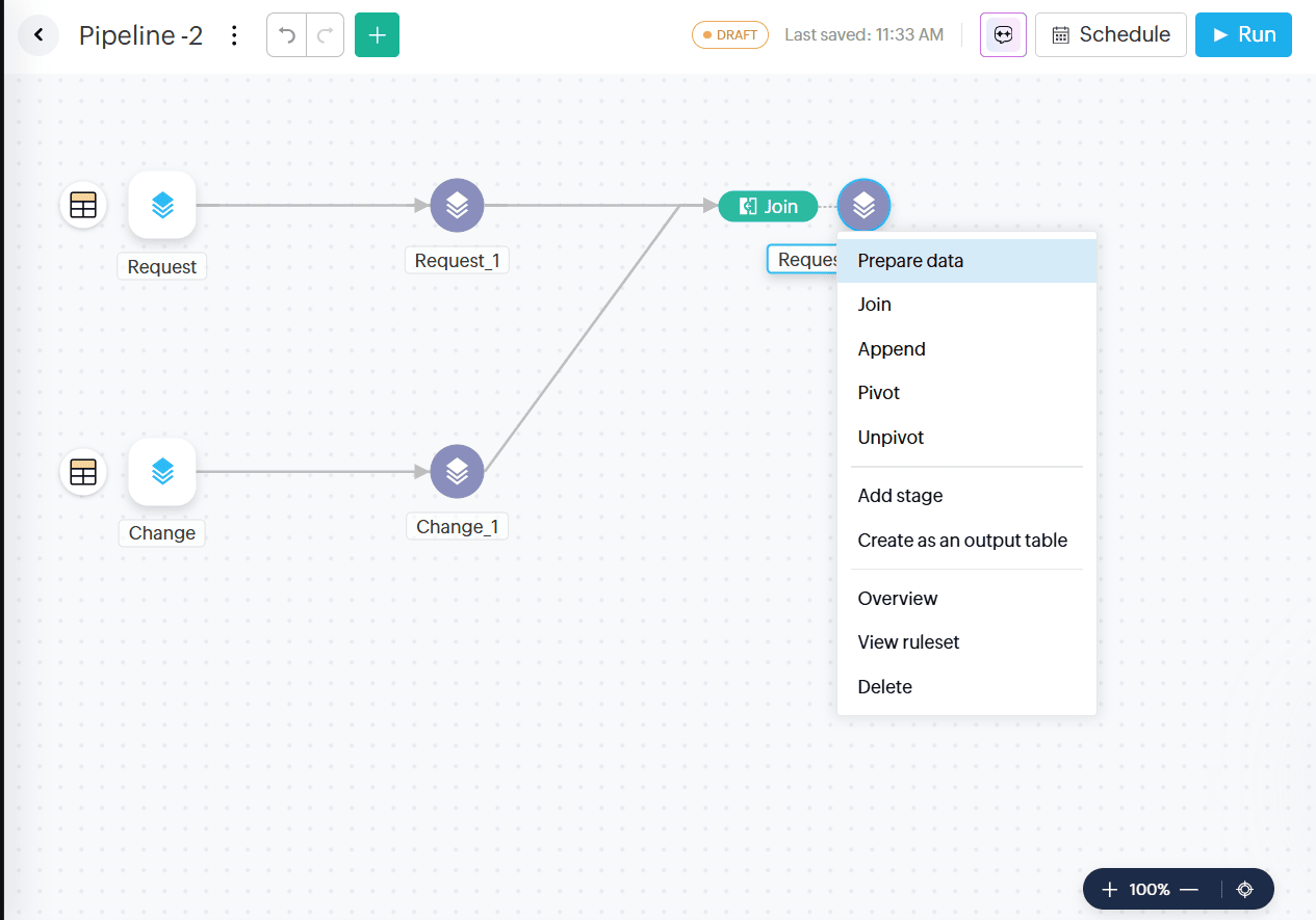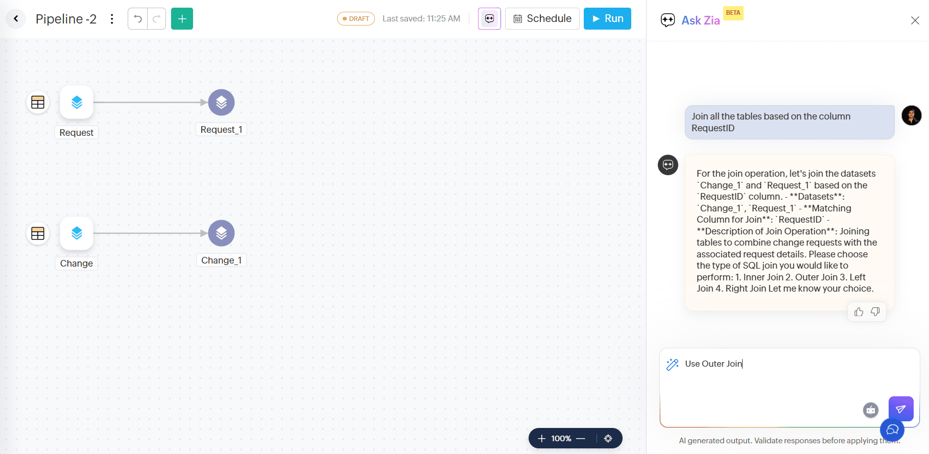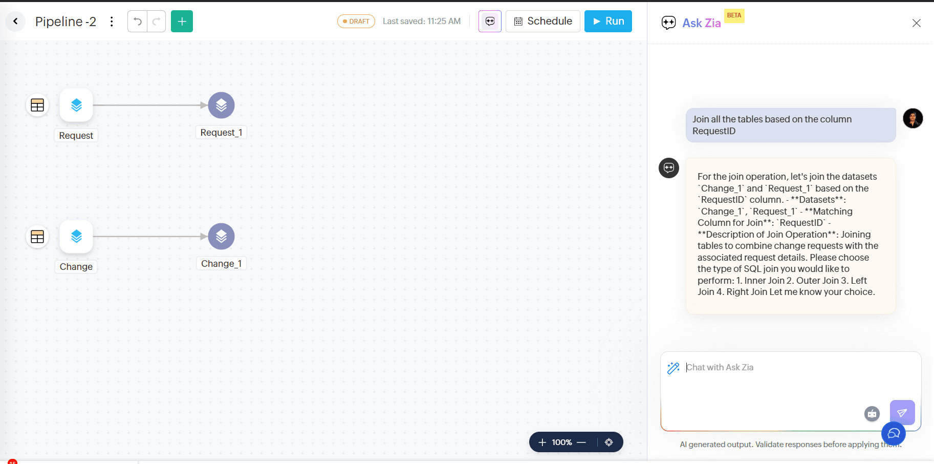 With Ask Zia in Pipeline Builder, you can import data from various sources, apply transformations, and export it to different destinations. You can also schedule the pipeline using Ask-Zia.
