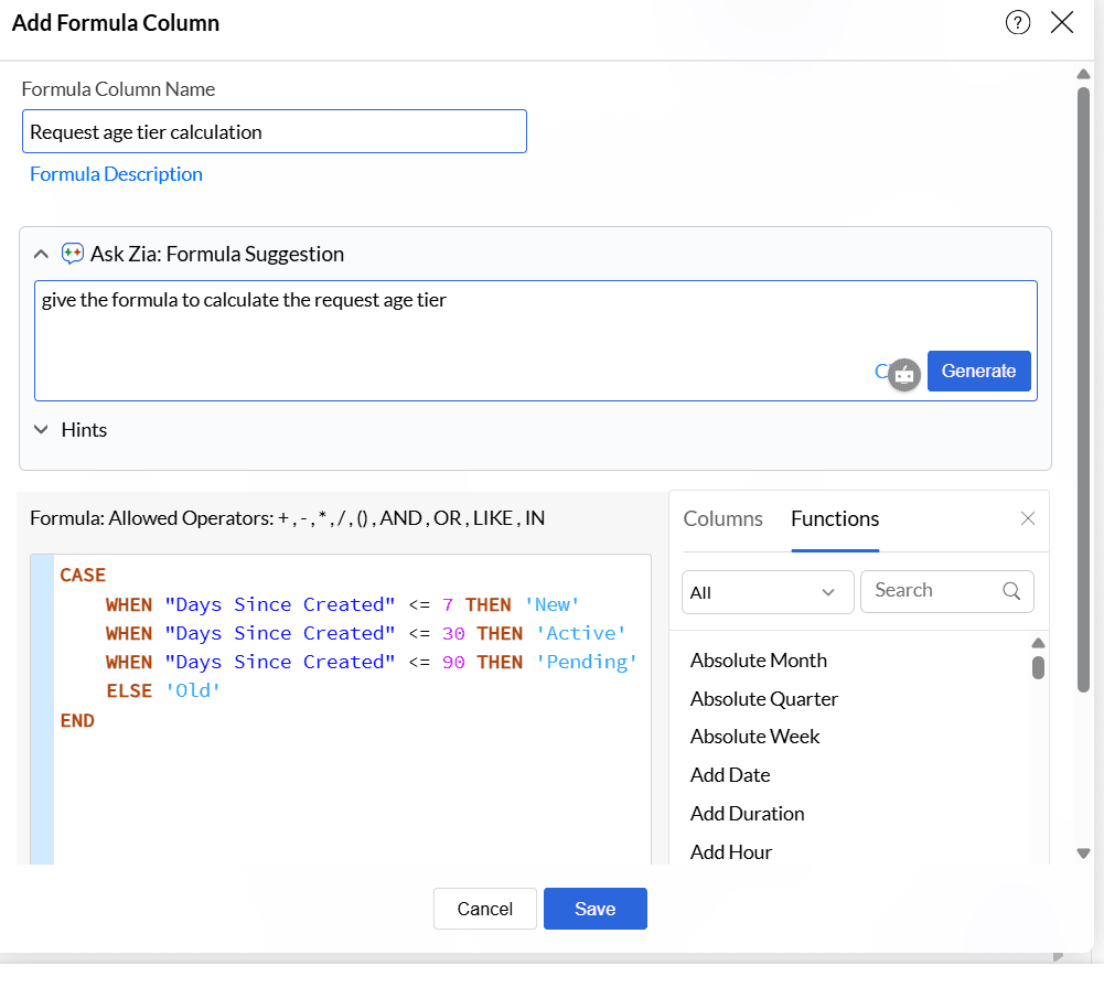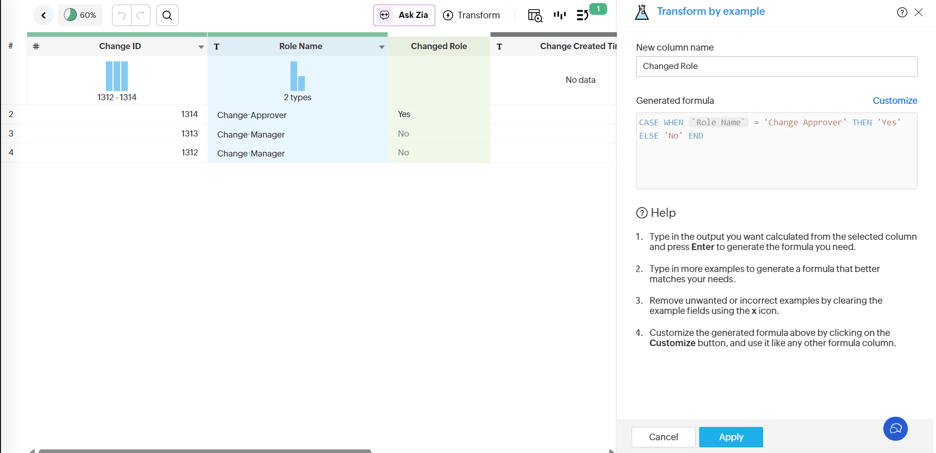 The Formula Suggestion feature lets you create calculated fields or transformations in plain language. Ask Zia will generate the required formula, which you can review and modify before applying.