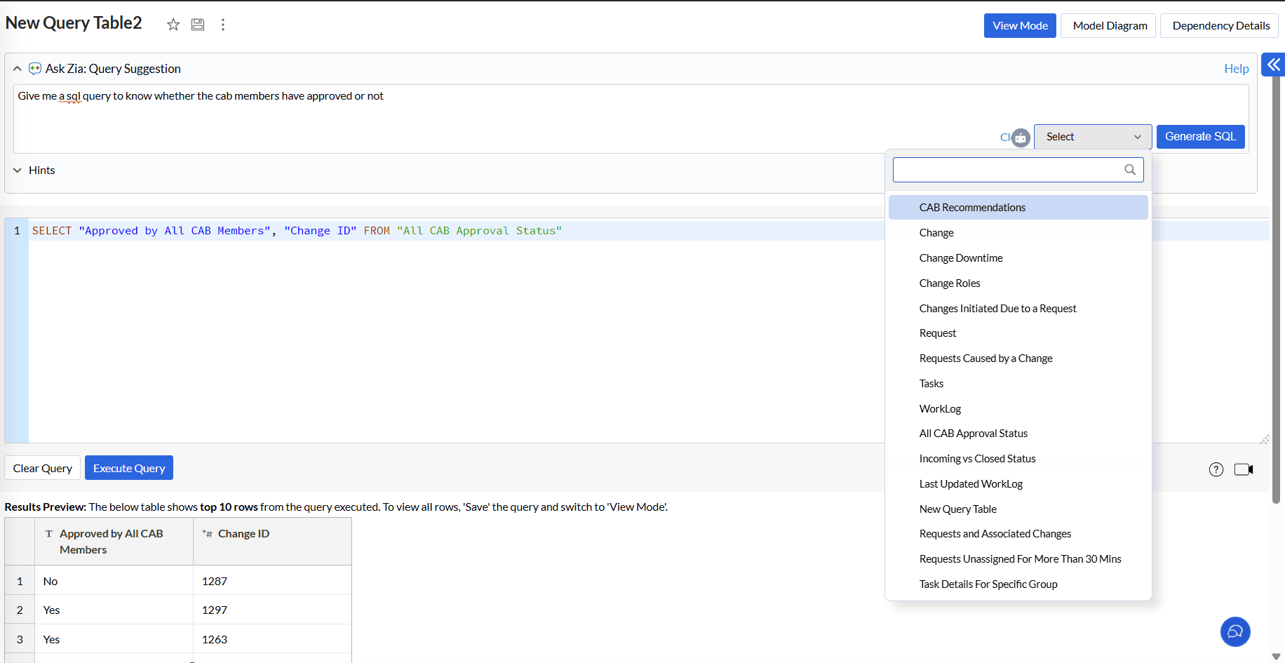 • Click the Ask Zia - Query Suggester drop-down icon.