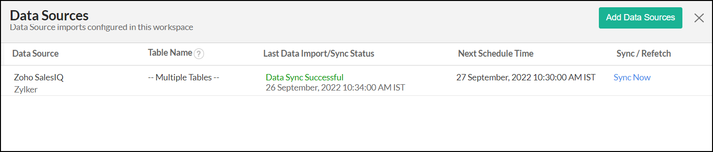 You can also access the Zoho SalesIQ data source page, and click Sync Now.