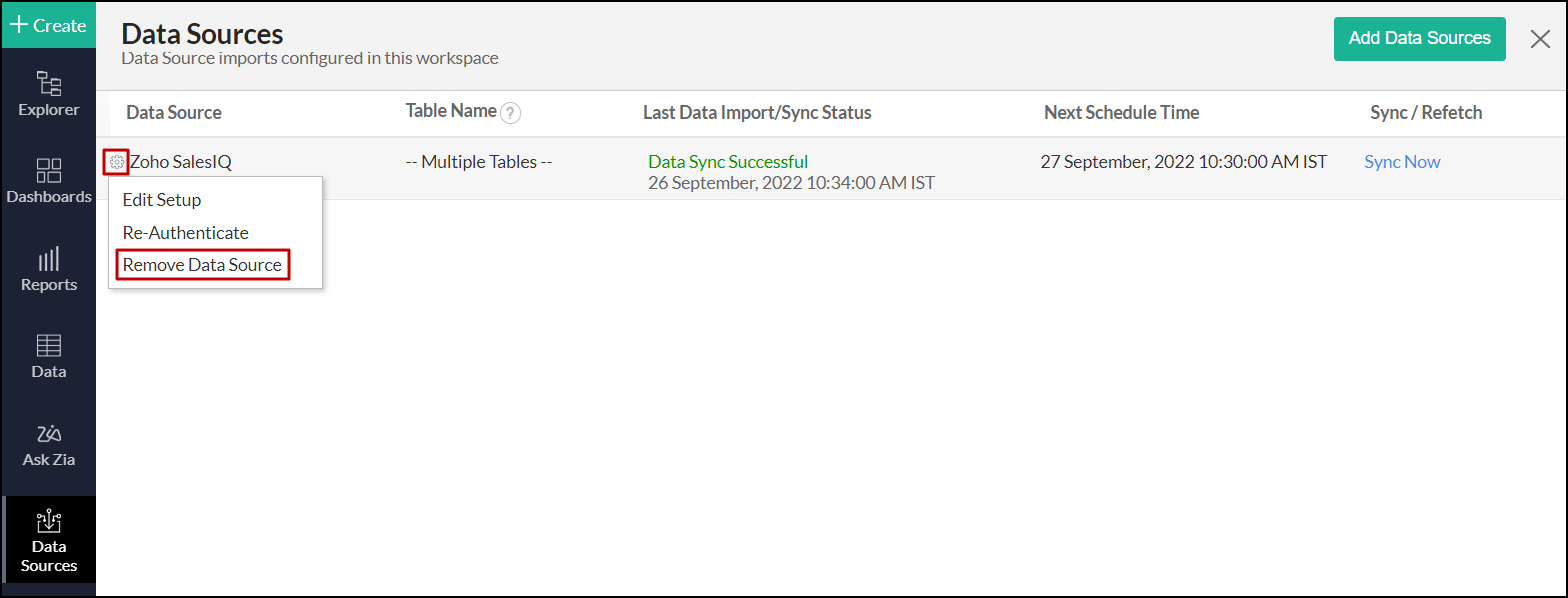 1. Click the Settings icon that appears on mouse over the Zoho SalesIQ data source and click the Edit Setup option.
