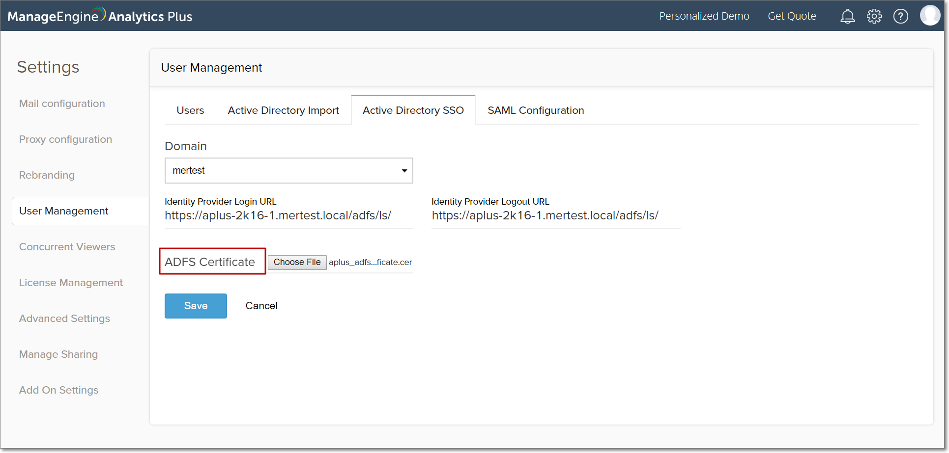 Select the configured Active Directory domain and provide the Identity Provider Login and Logout URLs. Upload the downloaded AD FS certificate, and click Save.
