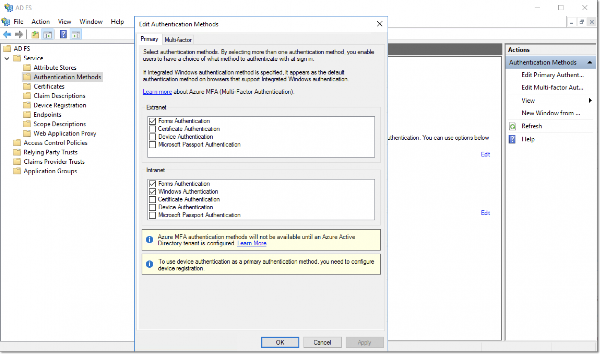Under Primary Authentication Methods, select the Forms Authentication option in the Extranet section and the Forms Authentication and Windows Authentication options from the Intranet section. Click OK.