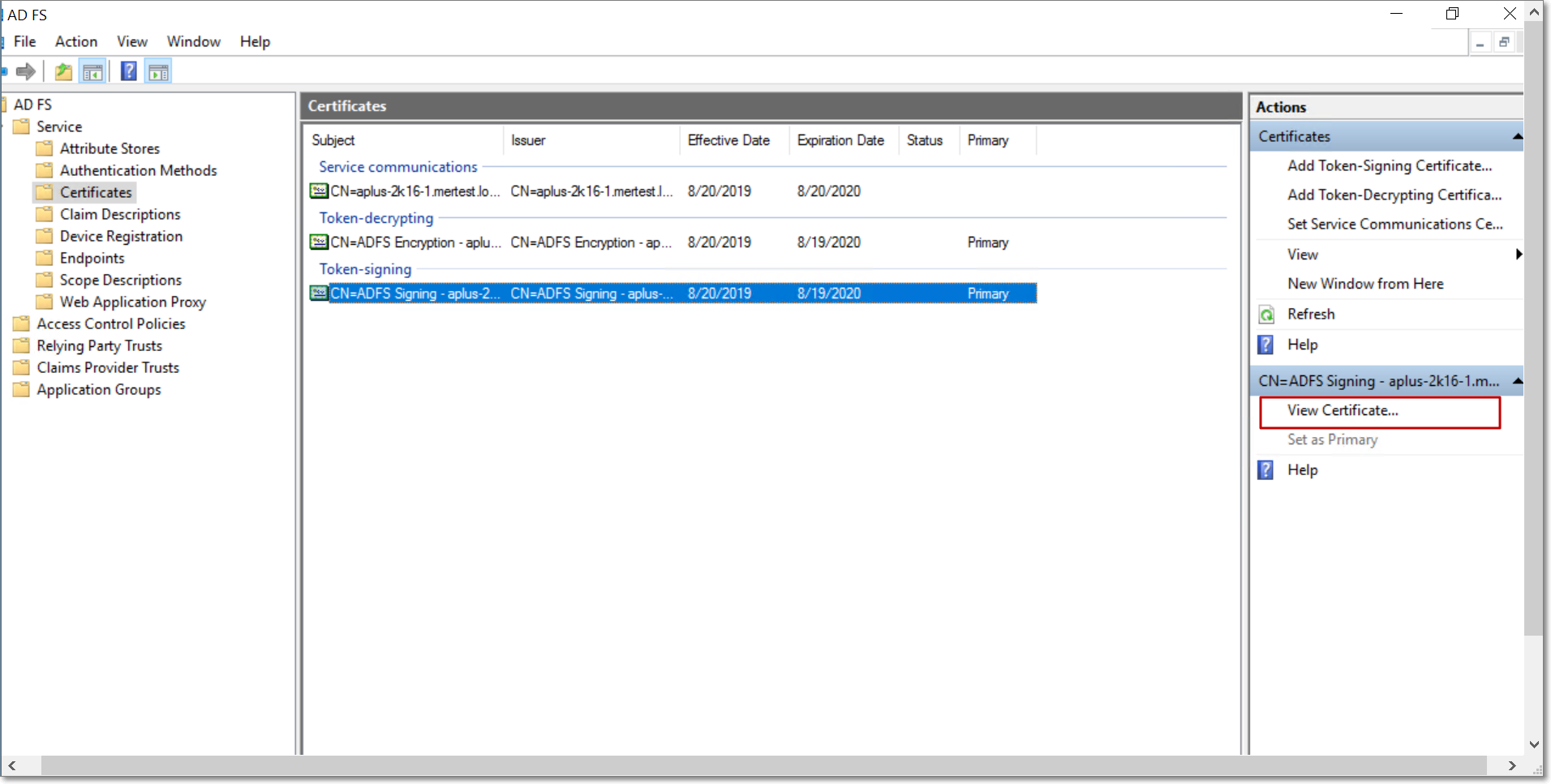 The AD FS certificate is now successfully configured. To download the certificate, navigate to the Certificates option in the left panel. Select the Token-signing certificate, and click the View Certificate option from the right panel.
