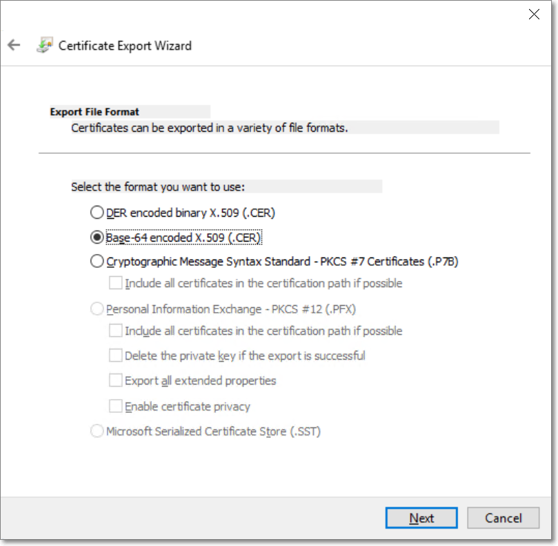 In the Certificate popup that appears, navigate to the Details tab. Click Copy to File. In the Certificate Export Window, click Next and select the export file format as Base-64 encoded X.509 (.CER).