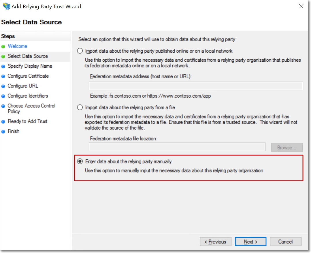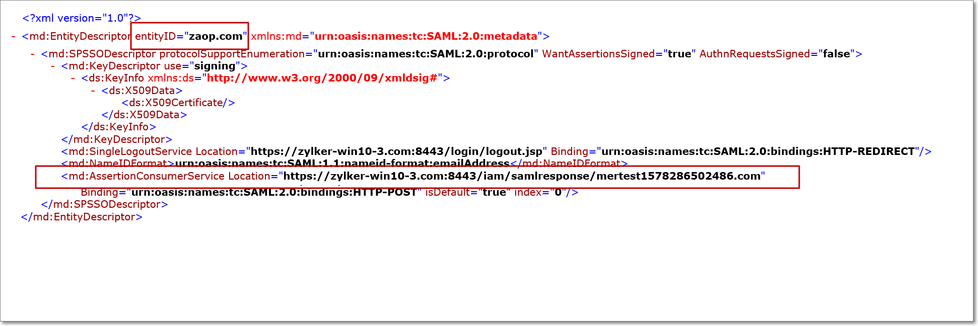 This metadata file contains the Assertion Consumer Service (ACS) URL and the identifier name, under the AssertionConsumerService Location and the entityID tags respectively. The ACS URL and the identifier name will be used in configuring relying party trusts in your AD FS software.