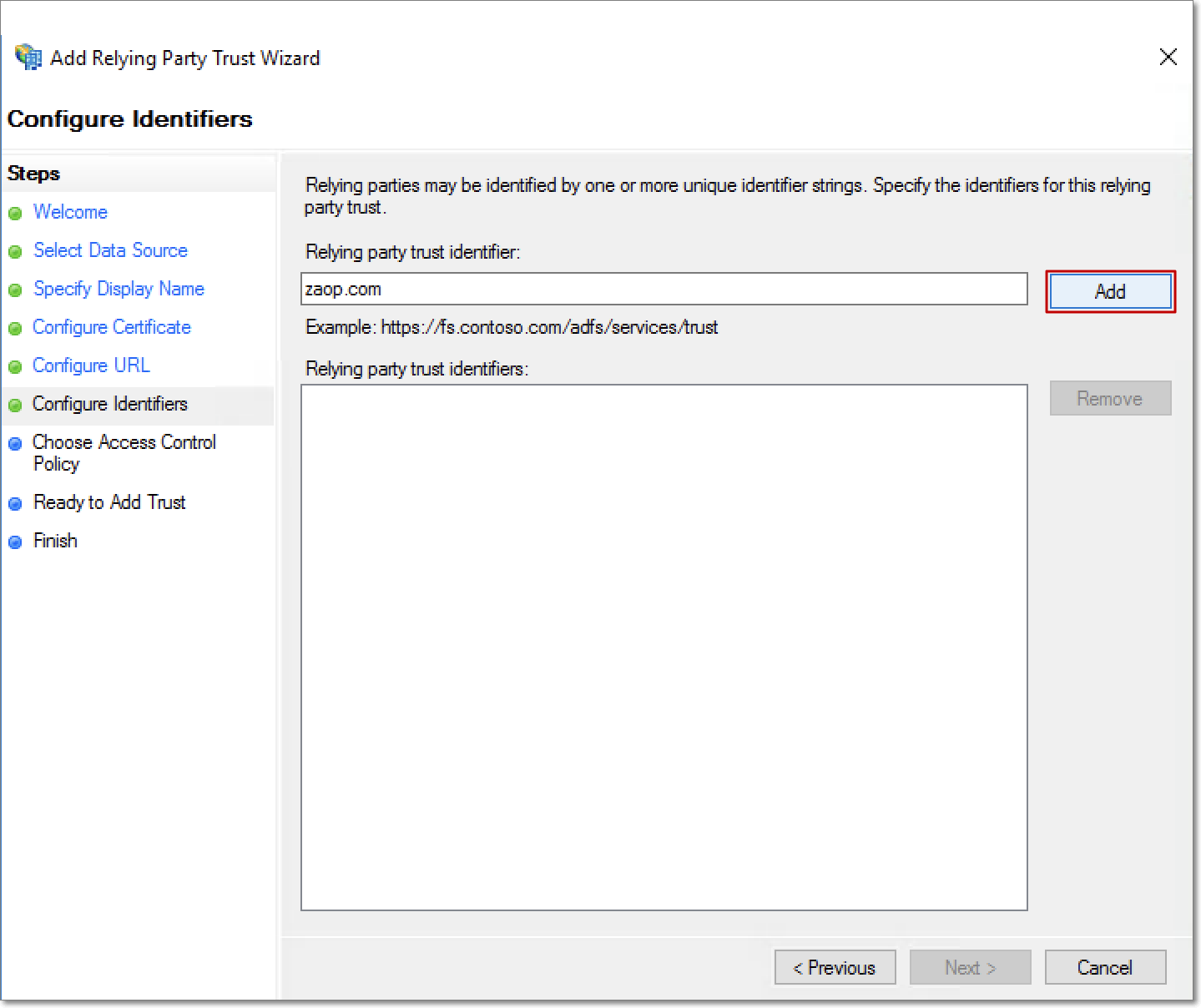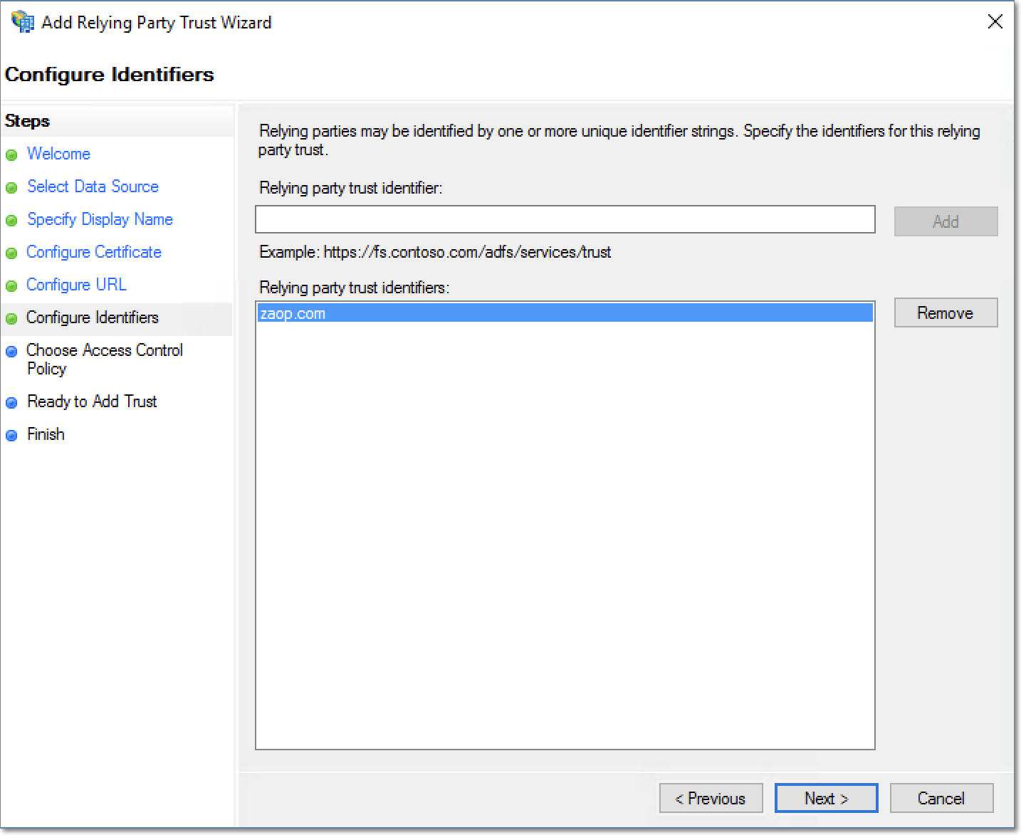 The new identifier will be included in the Relying Party Trust Identifiers section of the Configure Identifiers page. Click Next to proceed.