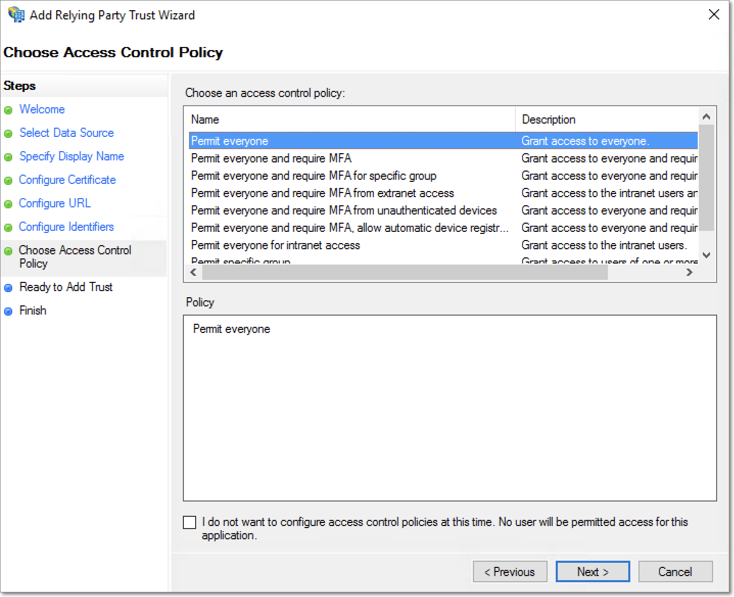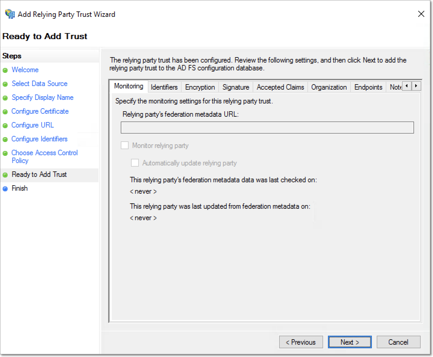 Review the configured settings, and click Next. The relying party trust will now be added to the AD FS configuration database.