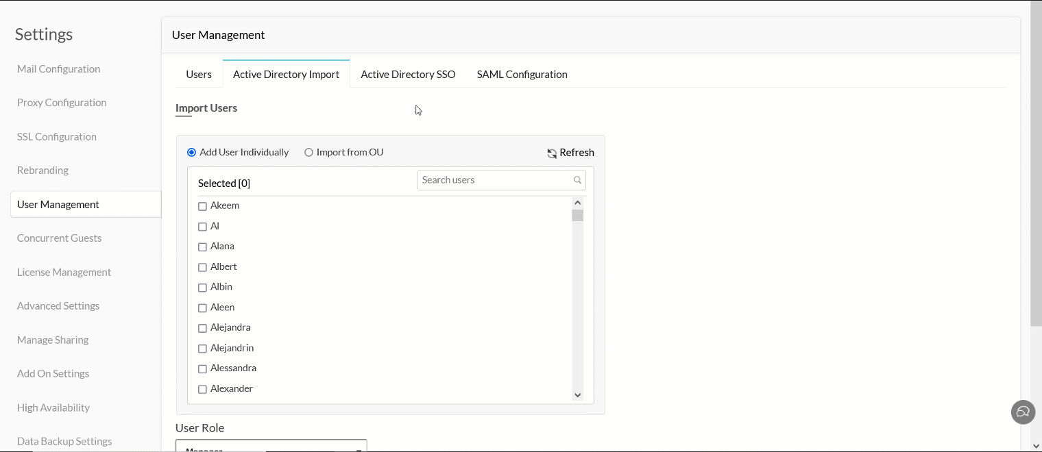 Navigate to the User Management section in the Settings page, and click the Active Directory Import tab.