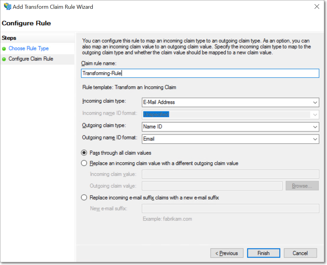 Provide a name for the claim rule, and select the Incoming and Outgoing claim types as E-Mail Address and Name ID respectively. Choose the Outgoing claim ID format as Email, and click Finish.