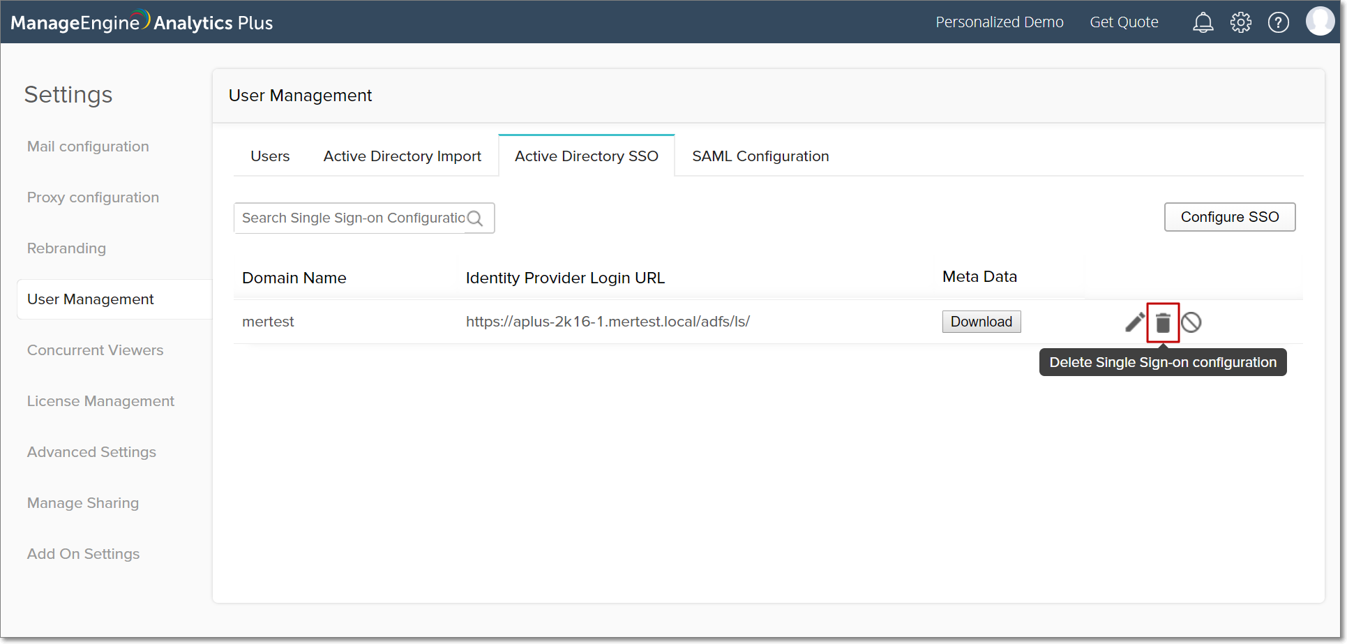 An Active Directory's single sign-on capabilities can be deleted from Analytics Plus, which will disable the single sign-on functionality for all users associated with that domain.