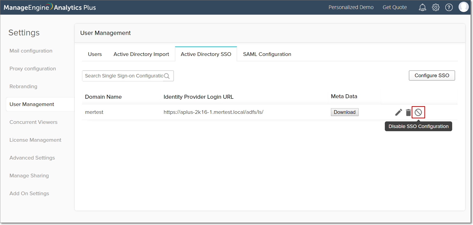 To disable your Active Directory single sign-on configuration, click the Active Directory SSO tab from the User Management page. Navigate to the required single sign-on configuration and select the Disable SSO Configuration button that appears on mouse over.