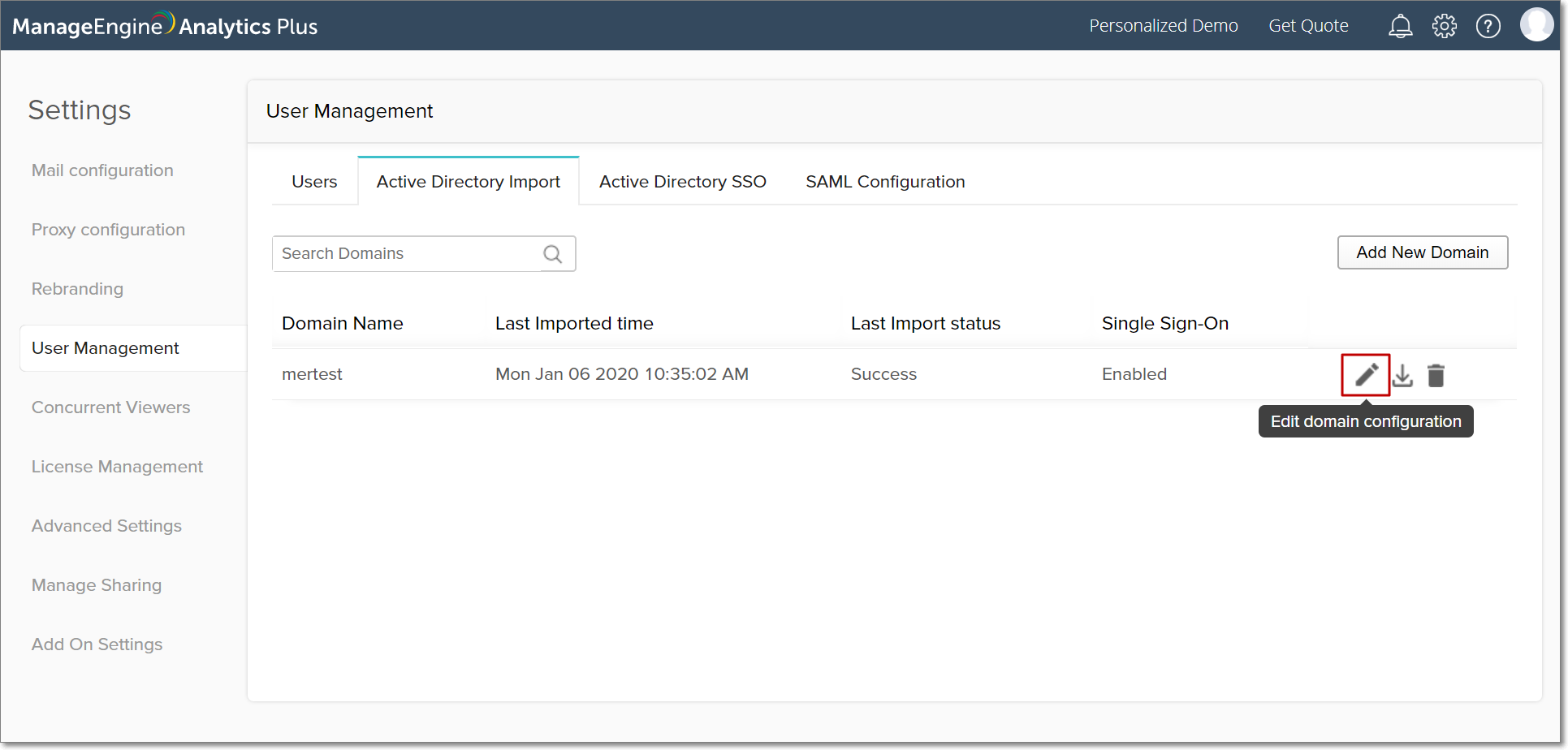 To edit your Active Directory configuration, navigate to the Active Directory Import tab in your User Management page. Click the Edit domain configuration button to make changes to the respective domain.