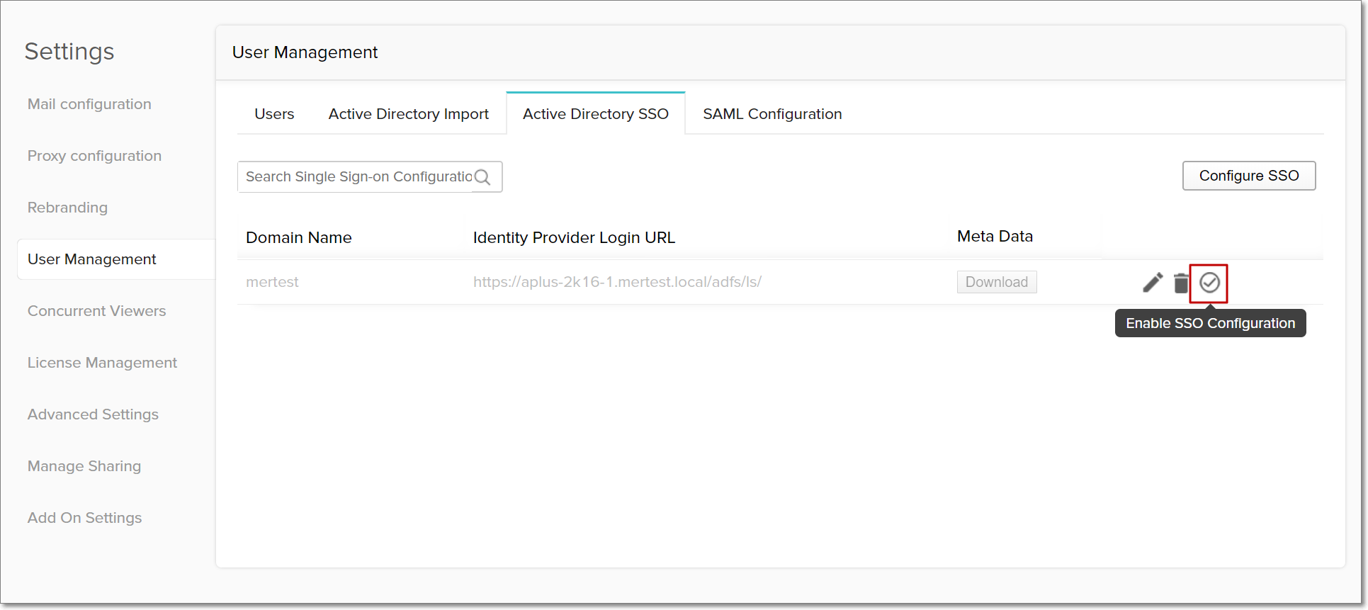 Once a single sign-on configuration is set up, single sign-on functionality is automatically enabled for all Active Directory users associated to the configured domain. However, to activate disabled domain configurations, navigate to the required configuration in the Active Directory SSO tab, and click the Enable SSO Configuration button that appears on mouse over.