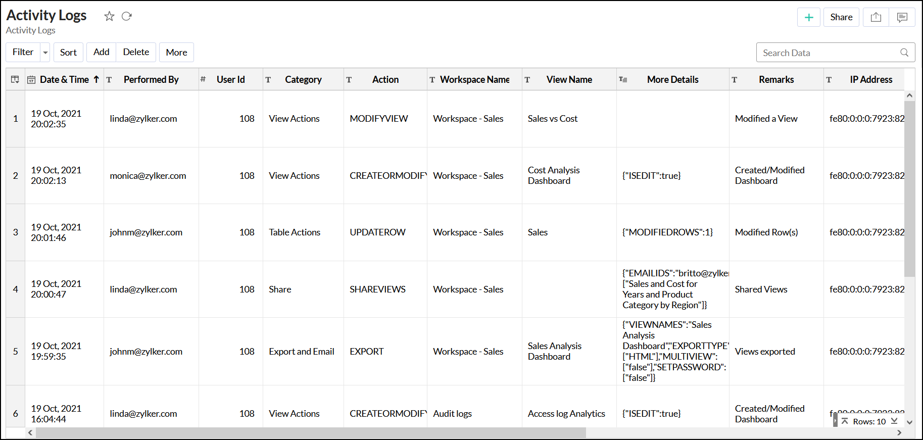 Analytics Plus allows you to log the user access information such as the name of the user who accessed the account, time of access, view name, IP address of the user, etc.
