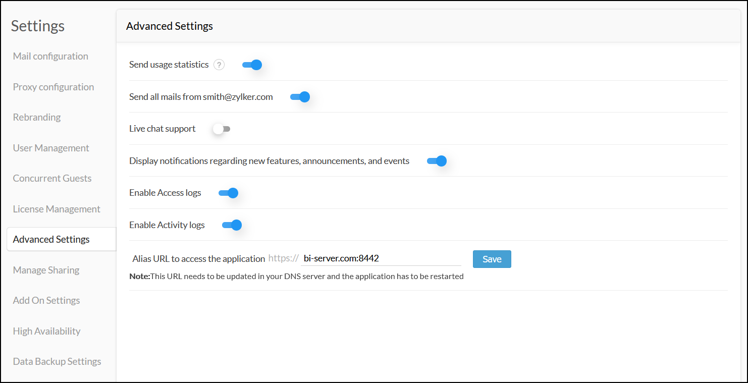 - Activity logs: This option enables the administrators to monitor all the activities performed by Analytics Plus users.