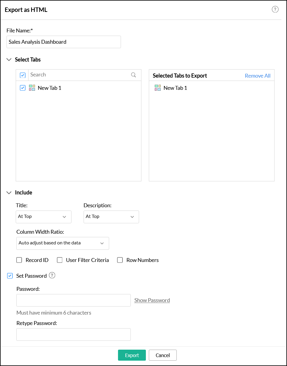 12. Select the Set Password checkbox to protect your exported file with passwords. The specified password has to be shared with all intended recipients separately, as Analytics Plus does not offer options to share your password through the application interface.