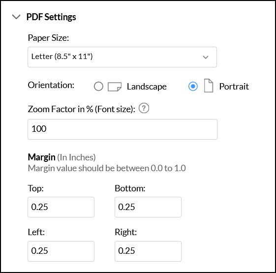 • Specify the margins for the exported dashboard file. This value should be between 0.0 to 1.0.