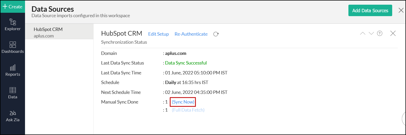 You can also access the HubSpot CRM data source page, and click Sync Now.