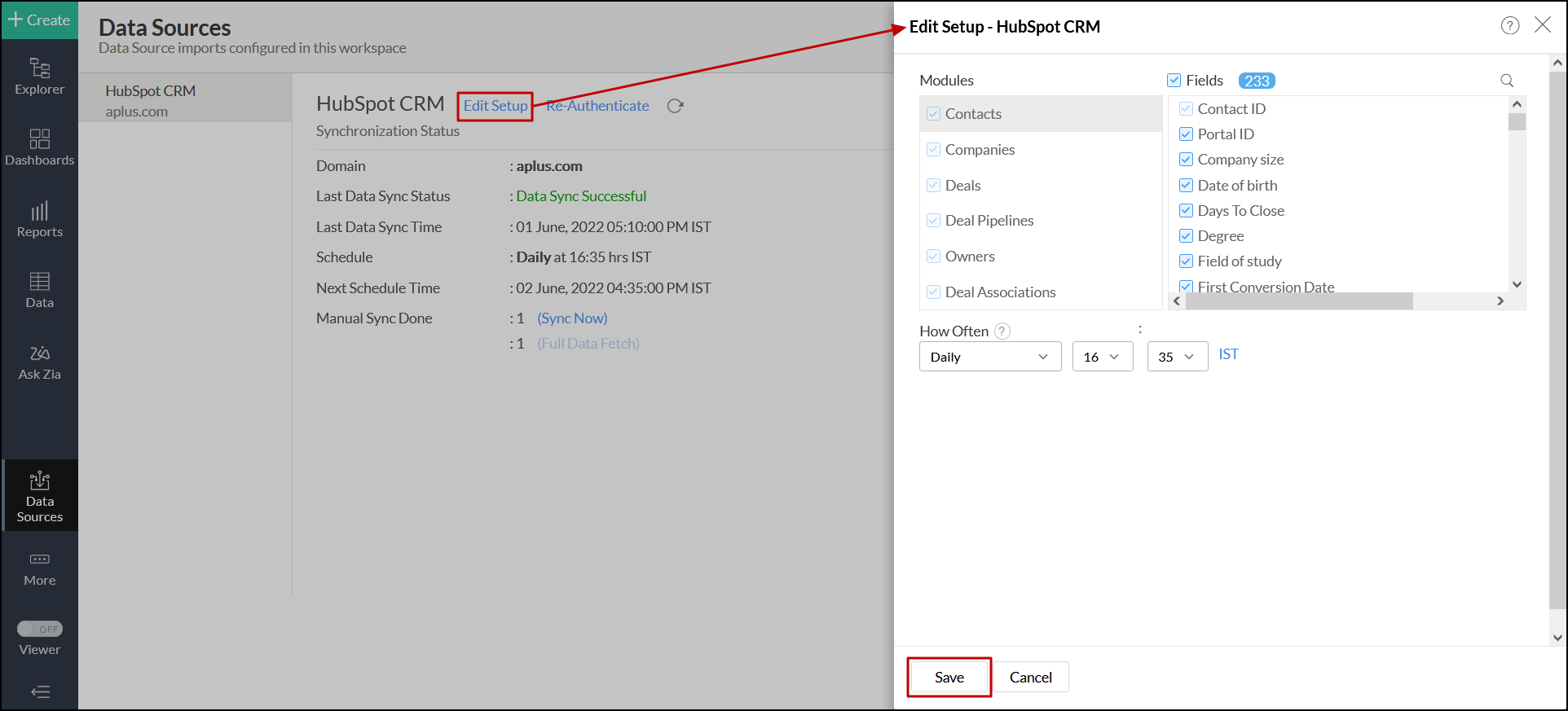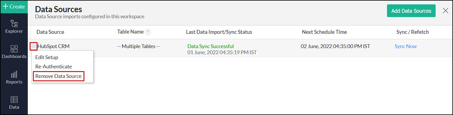 Click the Settings icon that appears on mouse over on the HubSpot CRM data source and click the Edit Setup option.