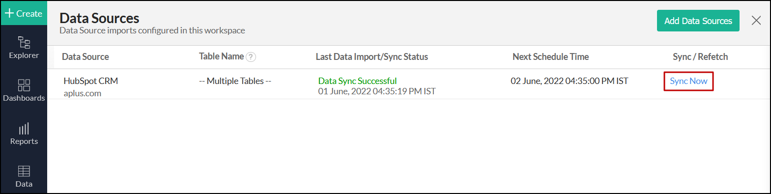 Yes. To do this, click the Data Sources option from the side panel. In the page that appears, navigate to the HubSpot CRM source and click the corresponding Sync Now button.