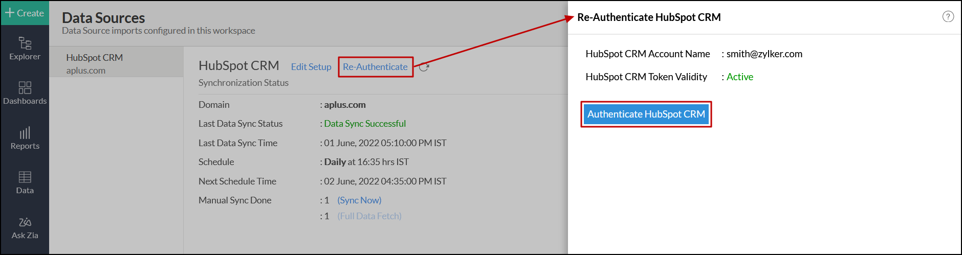 Navigate to the HubSpot CRM data source, and click the Re-Authenticate link.