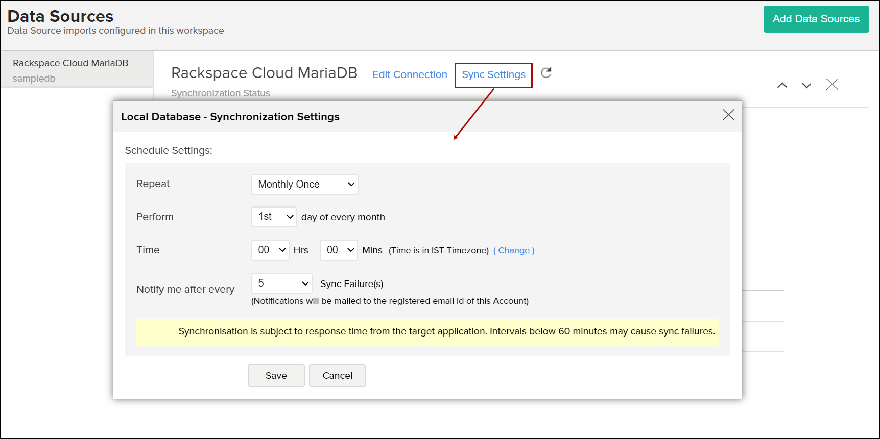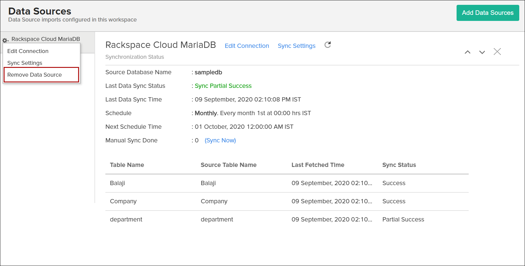 Select the Data Sources option from the side panel, and navigate to the required Rackspace Cloud Maria DB data source.