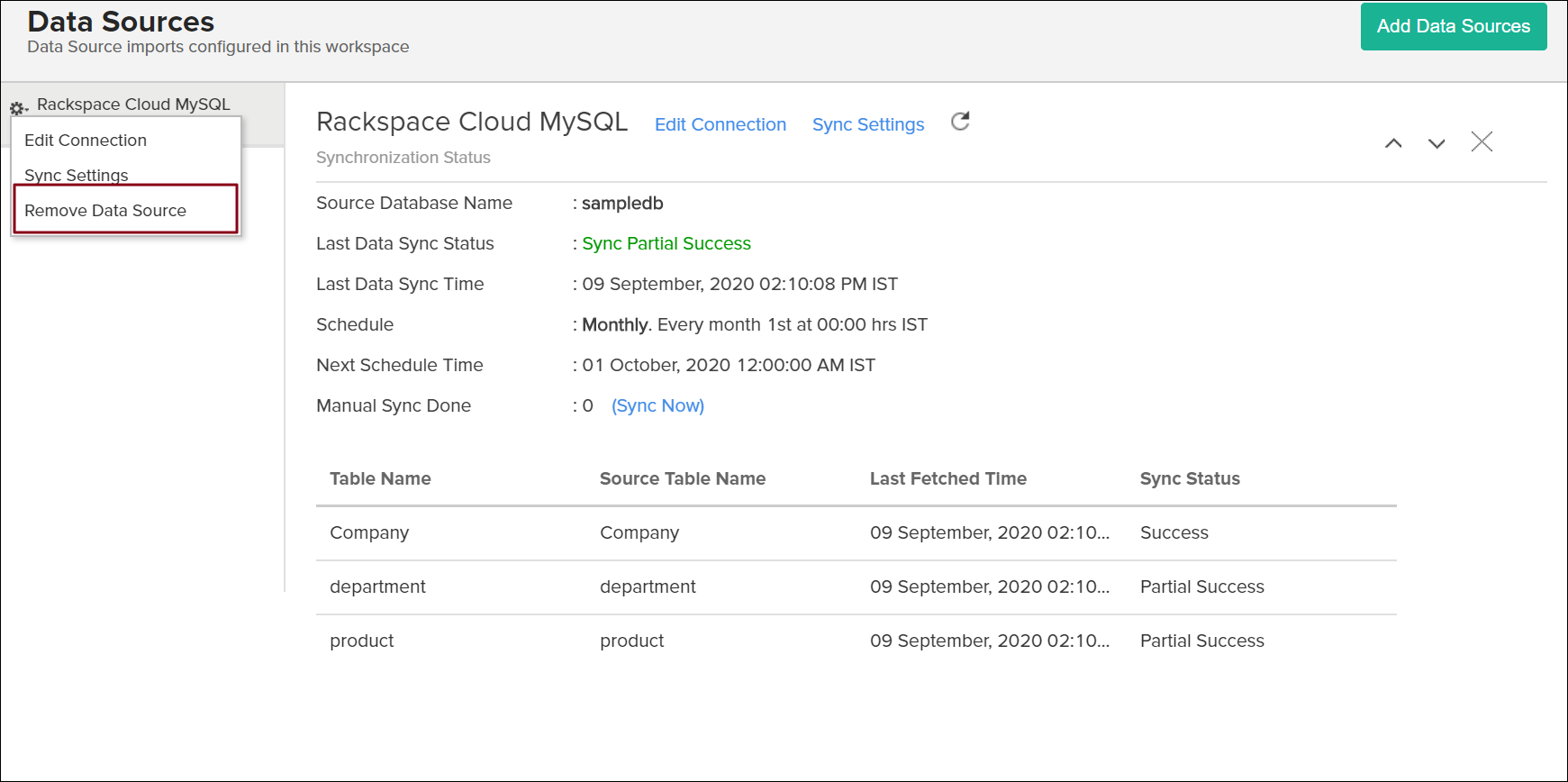 • Click the Settings icon that appears on mouse over the data source's name, and select Remove Data Source