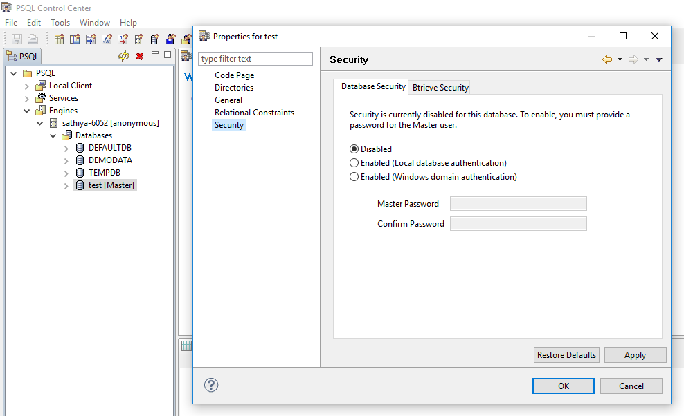 - Open the Pervasive SQL control center. Right-click on the engine name and click Properties.
