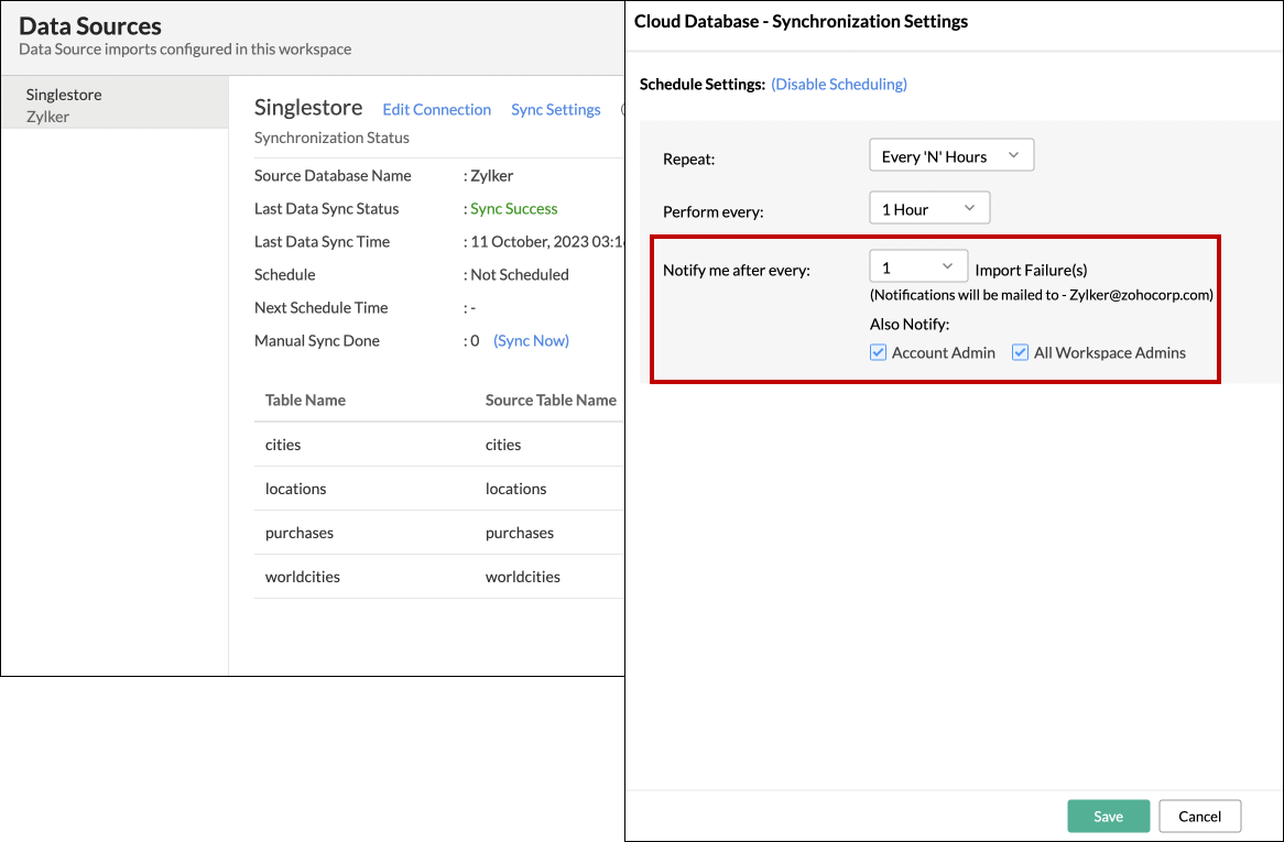 In the pop-up that appears, choose the required option from the Notify me after every 'N' Sync Failure (s) drop-down to get notifications on consecutive import failures.