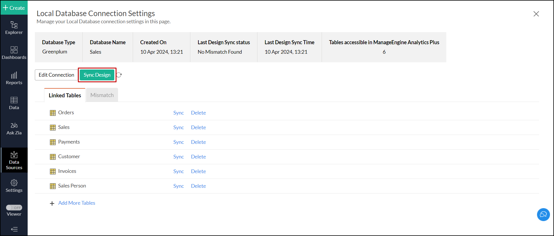 Note: In case of mismatches, you will not be able to add new tables. The mismatches need to be resolved first. Click here to know more about resolving mismatches.