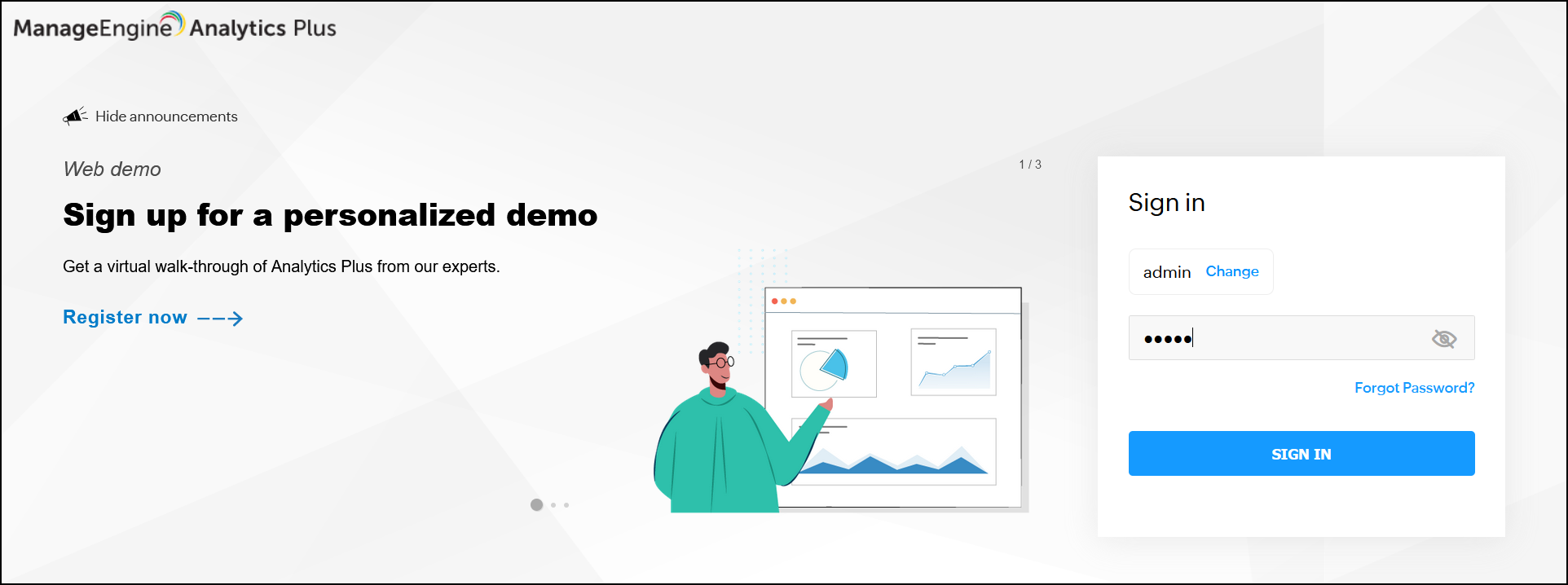 On successful installation, the Analytics Plus application will be launched in the browser. Provide the default username (admin) and password (admin), and click Sign In.