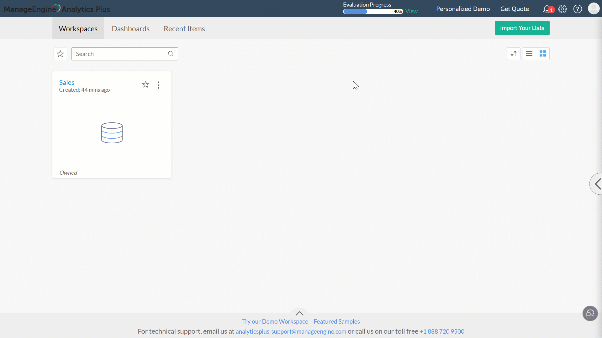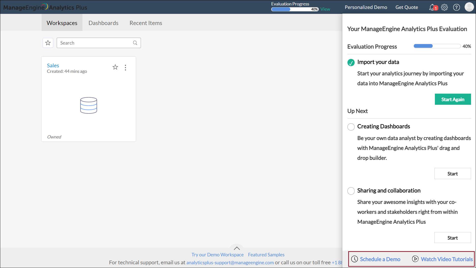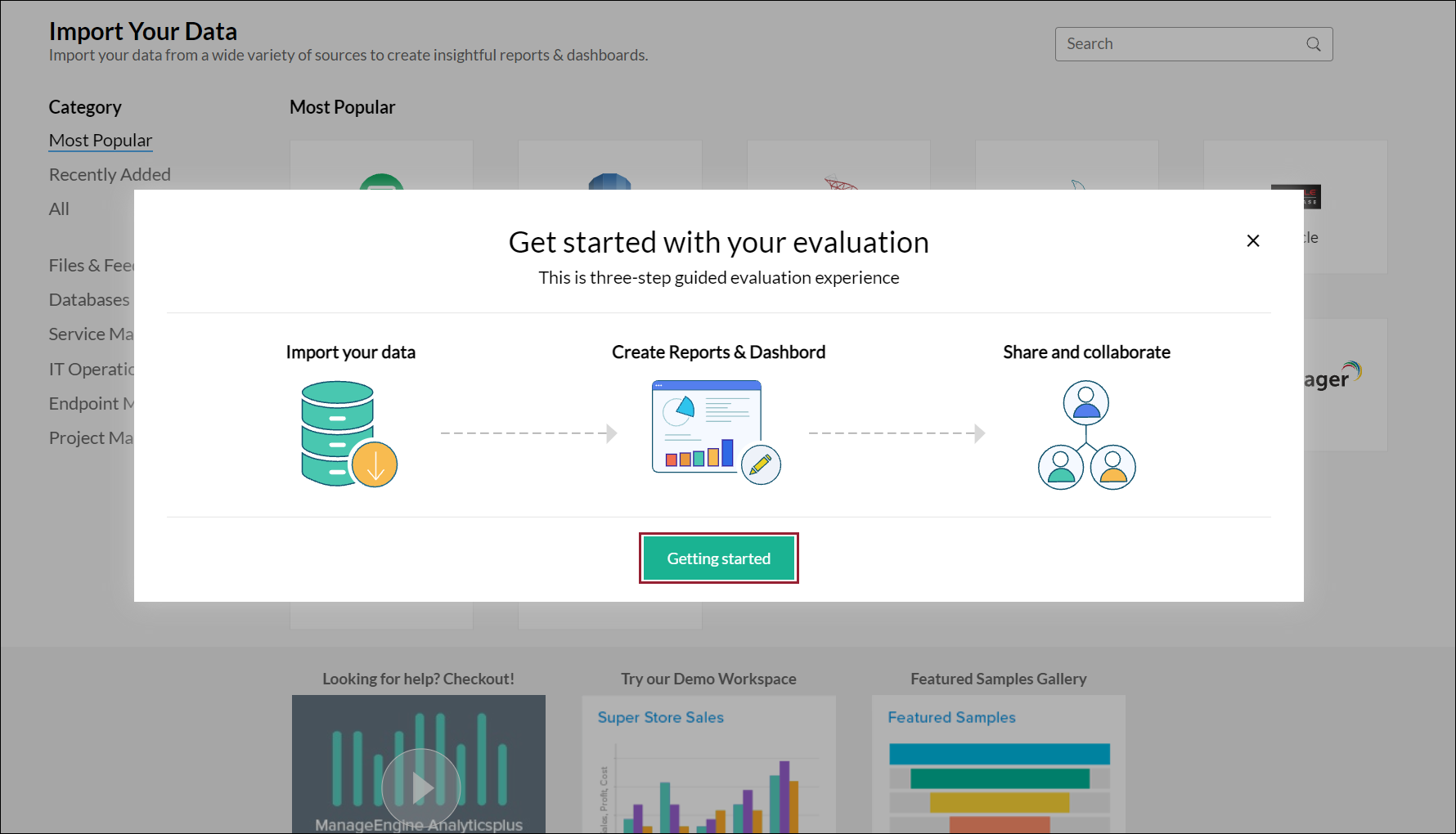 After configuring the required information, Analytics Plus offers a guided evaluation to help you import data, create reports and dashboards, and share the created visualizations. To begin this, click the Getting started button.