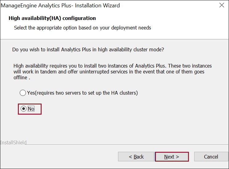 - Analytics Plus offers a high availability mode of installation, to facilitate uninterrupted services by configuring multiple instances of the application that run in tandem. To set up a high availability cluster, select the Yes radio button. Please note that the high availability cluster configuration will require two servers. To learn more about the steps involved in configuring high availability in Analytics Plus, click here.