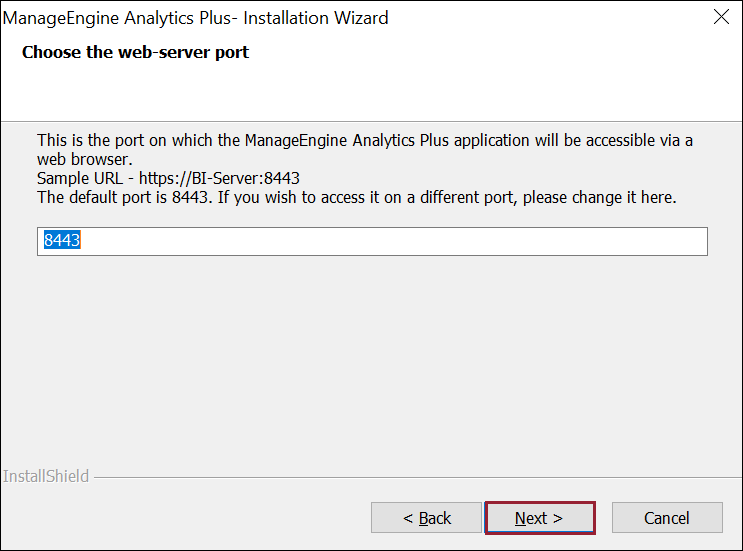 Enter the web server port number. The default port number provided is 8443. You can specify an alternate port number if 8443 is being used by a different application. Click Next to proceed.