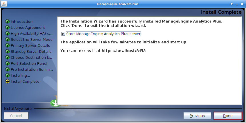 Execute the installation file ./ManageEngine_AnalyticsPlus_64bit.bin