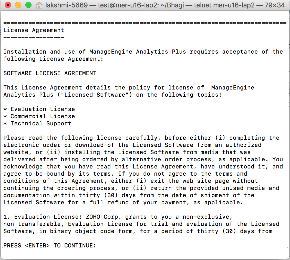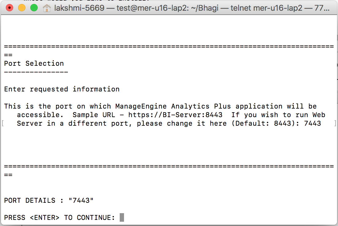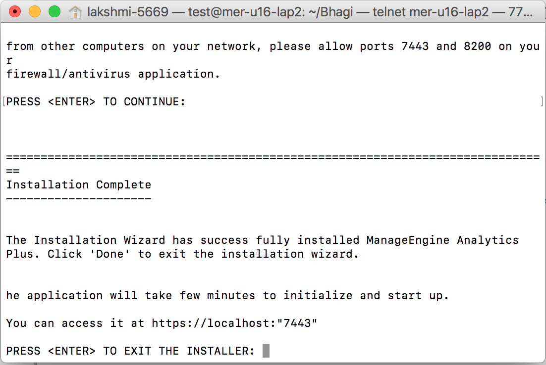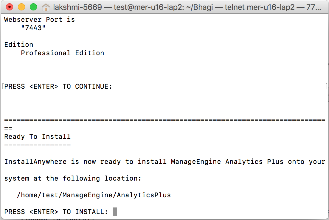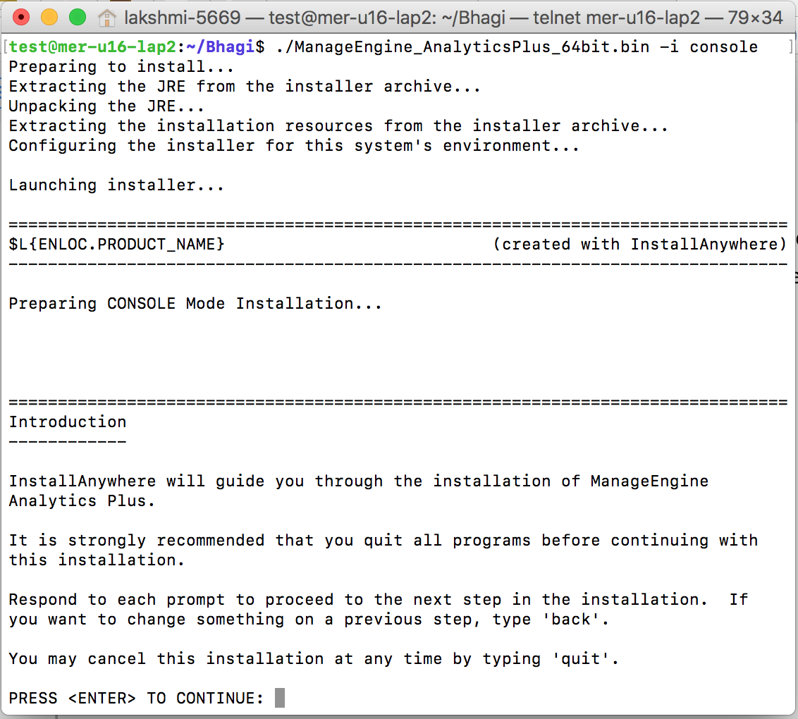 Execute the installation file ./ManageEngine_AnalyticsPlus_64bit.bin -i console in the command prompt.
