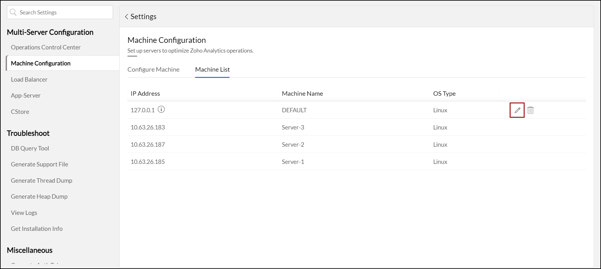 Analytics Plus lets you view all added server details under the Machine List tab, where you also have the option to edit or delete configurations as needed.