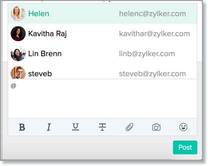 • Type @ in the Comment Editor. All participants of the comment thread will be listed, and you can select the user you wish to mention.