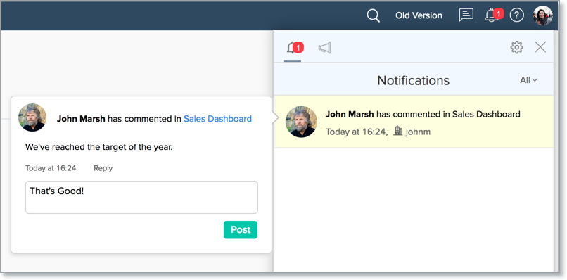 The notification icon at the top right corner will prompt attention. Click this to view the comment. You can open the corresponding view over which the comment is made by clicking the view's name. You can also make a quick reply to the comment from here.