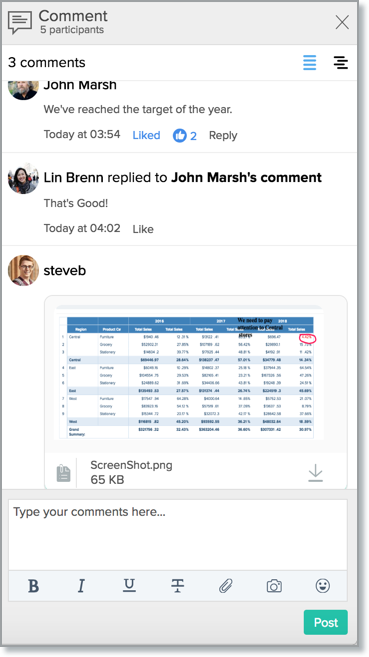 Yes, you can add attachments to the comment thread. Analytics Plus supports the sharing of the following file types, provided their size is within 5MB.