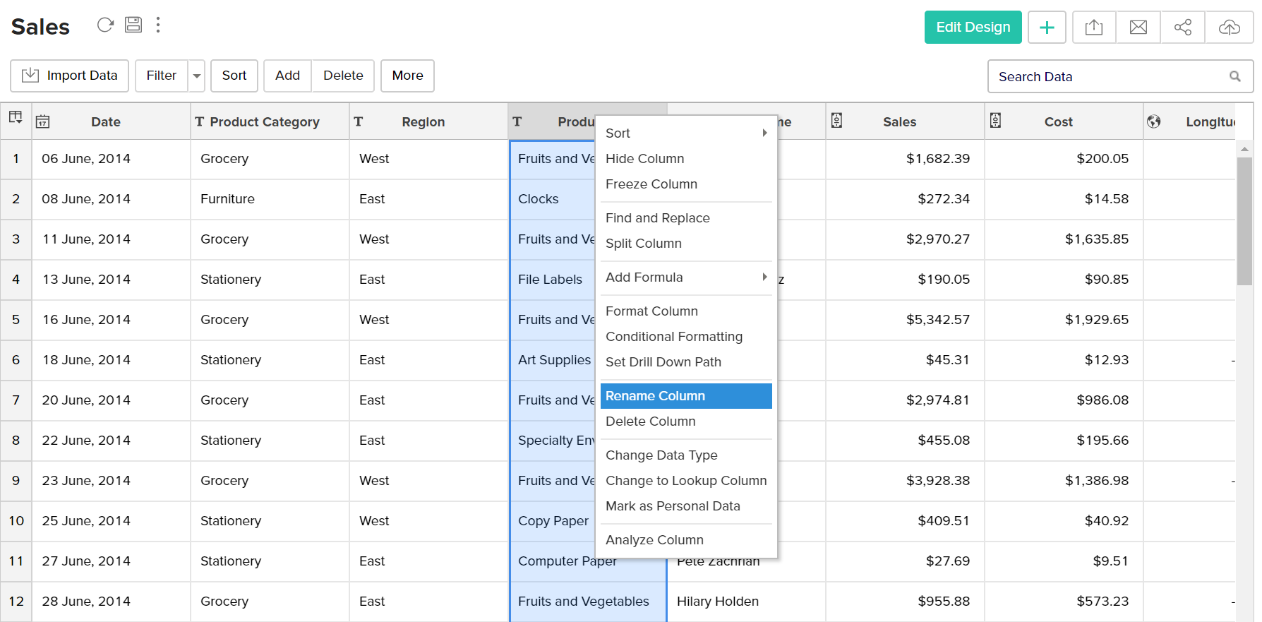 Each column has a set of properties like format, name, data type, etc. Column Properties option in the toolbar provides you with options to change these properties any time you want after creating a column.