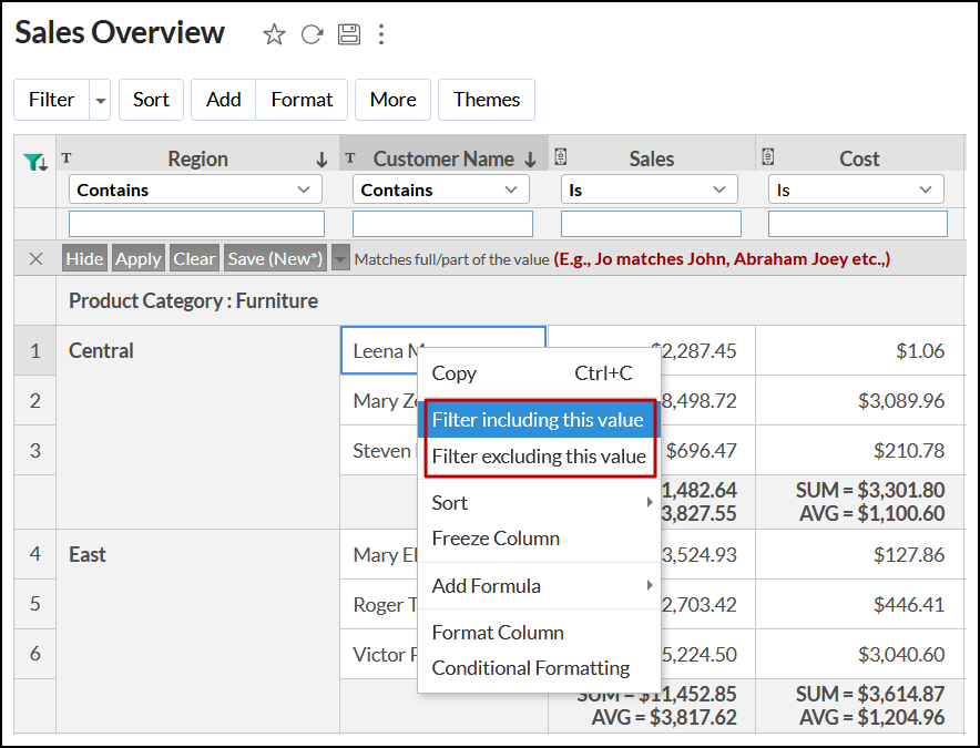 Analytics Plus also allows you to include or exclude specific values from a tabular view. To do this, right-click on the required data cell, and click the Filter including this value or the Filter excluding this value option to display data as required.