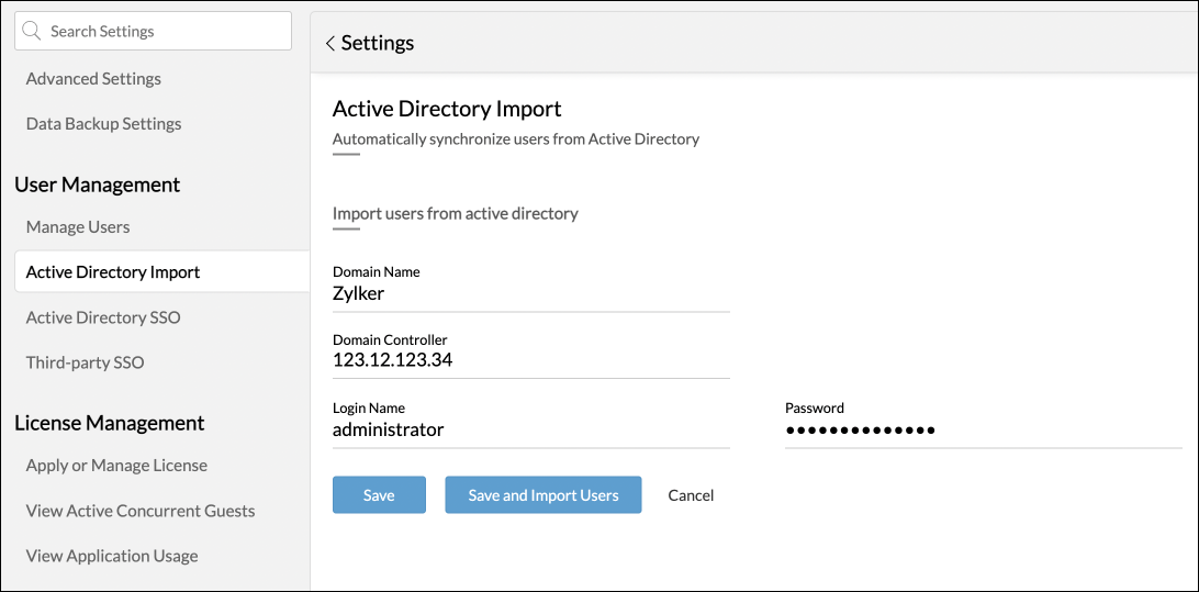 - Enter the required Active Directory domain, enter your credentials and click Save and Import Users.