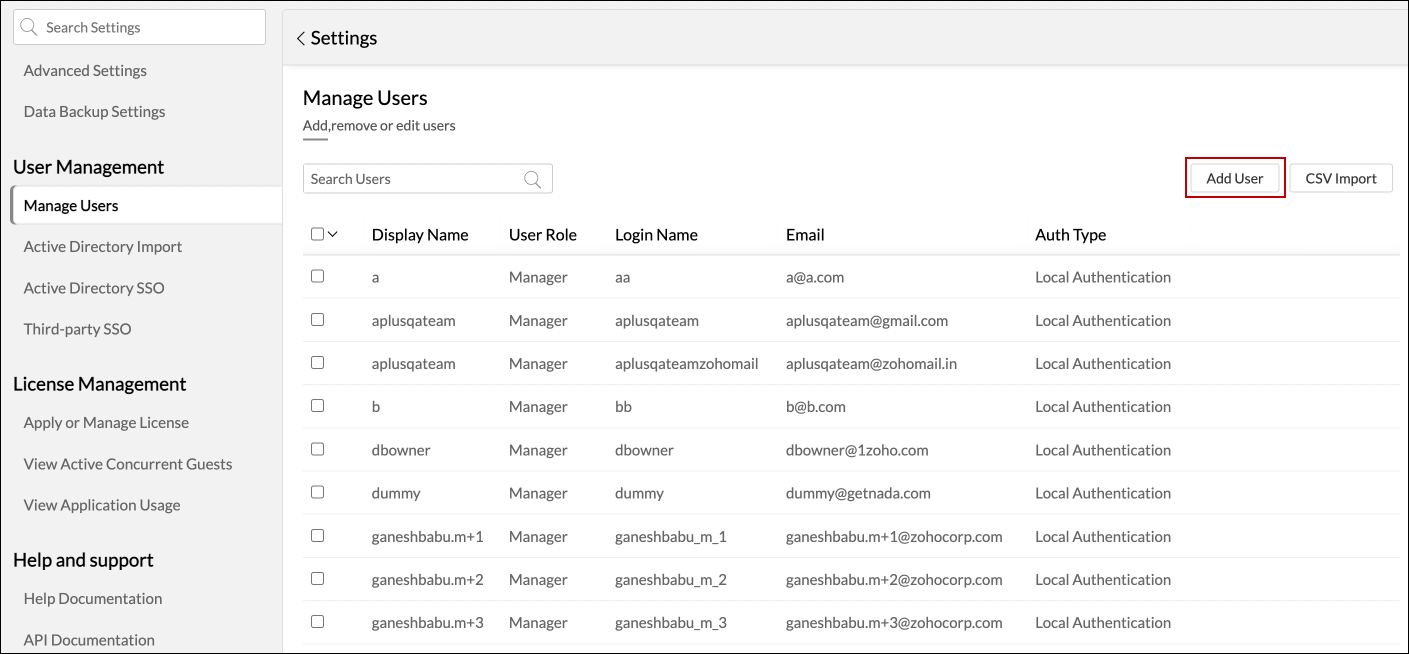 Analytics Plus allows you to add a group of users to Analytics Plus by importing CSV files containing several user details. Follow the steps below to import users from CSV files.