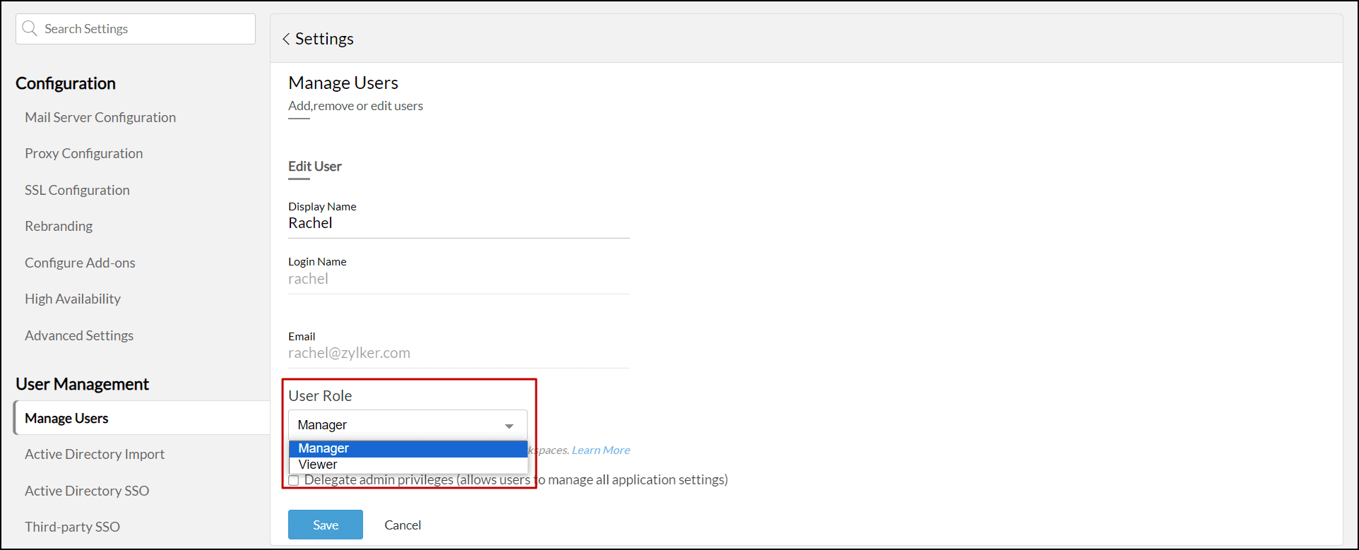 - Select the Allow user to perform configuration changes checkbox to enable users with the Manager role to perform admin-level changes such as adding or editing users, managing licenses, etc.