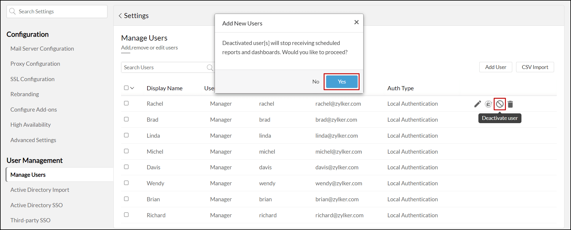 - To deactivate a user, navigate to the Settings page > Manage Users tab. Click the Deactivate user that appears on mouse over the required user name. In the confirmation pop-up, click Yes.
