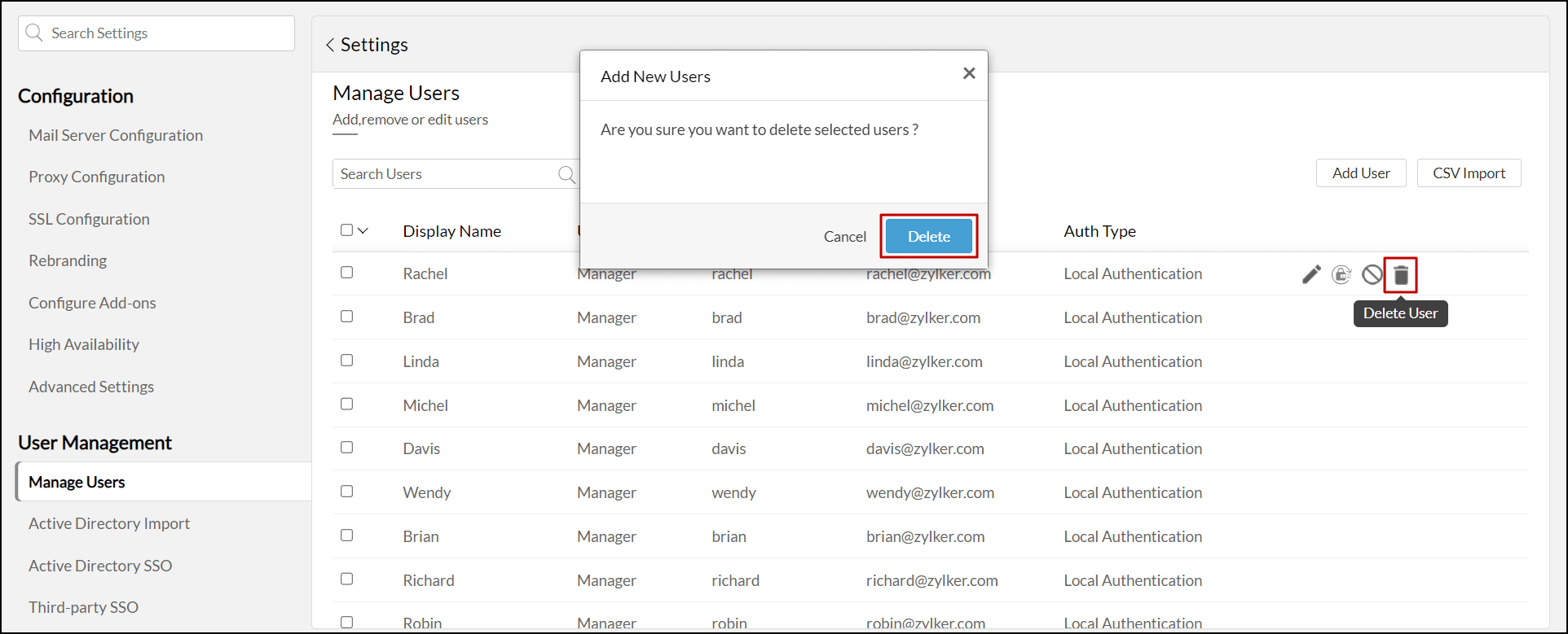 To remove a user from Analytics Plus, navigate to the Manage Users tab from the Settings page and click the Delete icon that appears on mouse over the required user name. In the confirmation pop-up, click the Delete button.