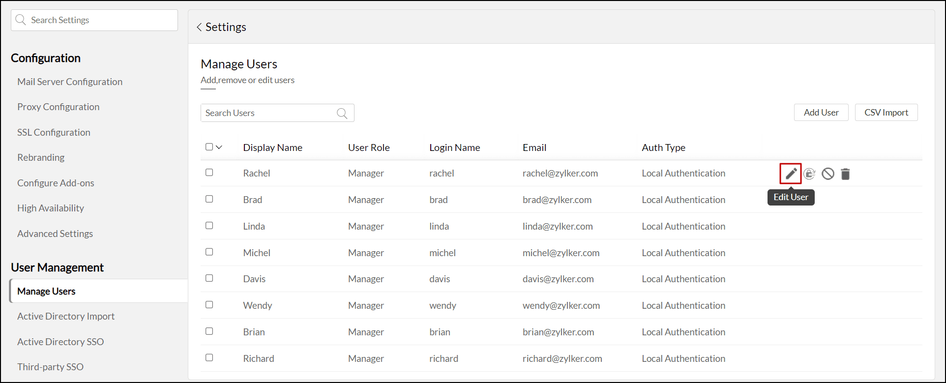 To edit the user information, click the Edit icon that appears on mouse over the required user from the user list view.